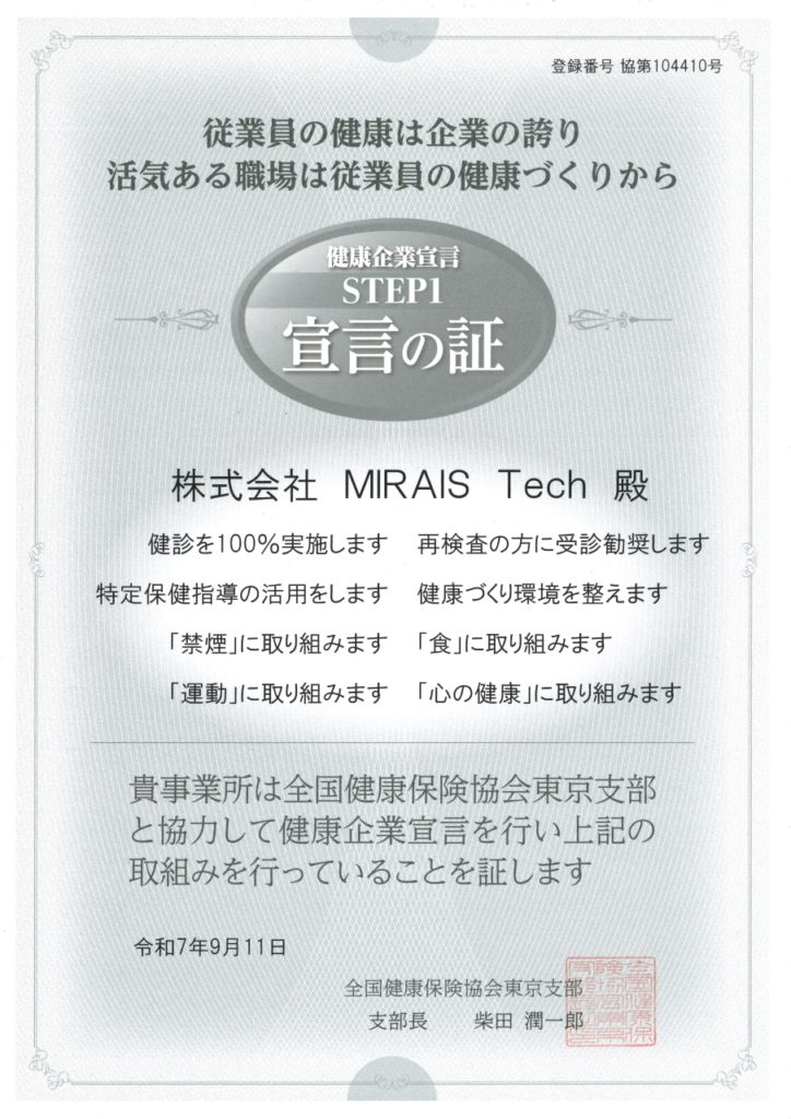 この度、株式会社MIRAIS Techは健康経営推進のため、2025年9月11日付で全国健康保険協会東京支部に健康企業宣言を行い、「宣言の証」を取得しました。